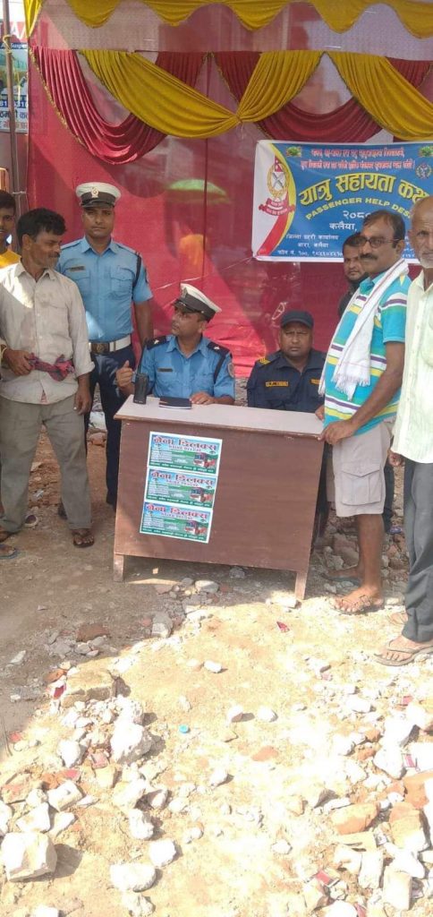 यात्रु सहायता कक्ष स्थापना गरिएकाे:-कलैया । नेपालीहरुको ठुला महान चाड दसैँ, तिहार तथा छठलगायतका पर्वलाई लक्षित गरी सवारी र यात्रुहरुको चाप बढ्ने हुँदा सवारि दुर्घटना न्युनिकरण गर्न र यात्रुहरुको गुनासो सुन्नको लागी जिल्ला ट्राफिक प्रहरी कार्यालय बाराको आयोजनामा कलैया को भरतचोकमा यात्रु सहायता कक्ष सञ्चालनमा ल्याइएको छ । जिल्ला ट्राफिक प्रहरी कर्यलय निजगढका प्रहरी निरीक्षक राम कुमार महतोले सहायता कक्षले समस्यामा परेका यात्रुलाई सहयोग गर्ने, यात्रुलाई ठगिनबाट जोगाउने लगायतका काम गर्ने जनाए । दसैँ, तिहार तथा छठ जस्ता ठुला चाडपर्वहरूमा यात्रुहरूको चाप बढी हुने र चोरी लुटपाट जस्ता घटनाहरू घट्ने सम्भावनालाई मध्येनजर गर्दै चाडबाड लक्षित यात्रु सहायता कक्ष स्थापना गरी सञ्चालनमा ल्याइएको जिल्ला ट्राफिक प्रहरी कार्यालयका प्रमुख प्रहरी निरीक्षक राम कुमार महतोले जानकारी दिए । चाडबाडका बेलामा बसपार्कमा धेरै यात्रुहरू आवतजावत गर्ने, सवारी साधनको चाप बढ्ने, टिकट काउन्टरमा यात्रुको भिडभाड बढ्ने, बढी भाडा लिने जस्ता क्रियाकलाप हुने तथा यात्रु ठगिने कार्यलाई नियन्त्रण गर्न, यात्रुको सामान हराउने, सवारीमा क्षमताभन्दा बढी यात्रु राख्दा दुर्घटनाको जोखिम हुनेलगायतका समस्या कम गराउन र नागरिकको पिरमर्कालाई तत्कालै सुनुवाइ गरी समस्या समाधान गर्नका लागि यात्रु सहायता कक्ष स्थापना गरी सञ्चालन गरिएको उनले बताए ।