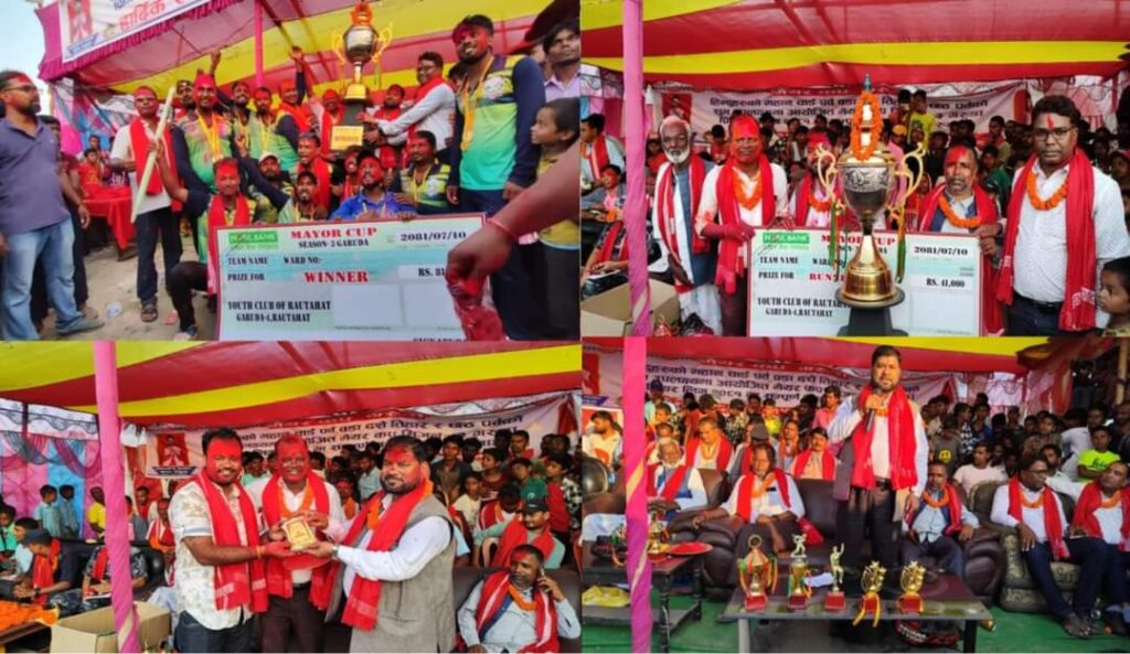 कामना गर्दै गरुडा नगरपालिकाको सहयोग तथा युथ क्लव अफ रौतहटको आयोजनामा भएको खेलमा सम्पन्न गराउनु भुमिकासथ खेल्नु हुने सम्पुर्णमा नगर प्रमुख कन्थमणी प्रसाद जयसवालले