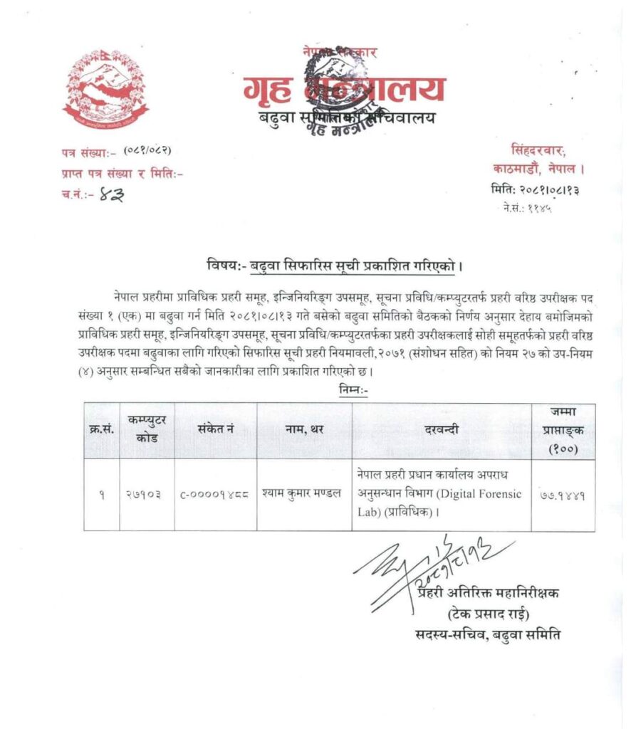 HomeAd-LandscapeAdsbar-6 प्राविधिक प्रहरी समूह, इन्जिनियरिङ्ग उप-समूह, सूचना प्रविधि/कम्प्युटरतर्फ प्रहरी वरिष्ठ उपरीक्षक पदमा बढुवा सिफारिस सूची प्रकाशित छ । मधेश प्रदेश खवर November 29, 2024 84 0 ताजा / भरखरै प्राप्त ७०Th.पुलिस दिन मा मधेश प्रदेश प्रहरी ले सम्मानित ब गरेको तस्वीर.धन्यवाद. October 17, 2025 तिहार नजिकदै माटोको भाडा पर्साका घन्टाघर क्षेत्रमा बिक्रीवितरण:- October 17, 2025 बजार विश्लेषकहरूले अन्तर्राष्ट्रिय बजारमा बढ्दो माग र अमेरिकी डलरको उतारचढावलाई मूल्य वृद्धिको मुख्य कारण रहेको बताइन्छ । October 17, 2025 धानबालीरुपन्देहीको सियारी गाउँपालिका-७ स्थित अमुवामा स्थानीय किसानको खेतमा पाकेको धानबाली ।तस्बिर :सुमित्रा चापागाई (अधिकारी)/रासस October 17, 2025 जिल्ला प्रहरी कार्यालय बाराद्वारा ४ जना सञ्चारकर्मी सम्मान:- October 17, 2025 Share FacebookTwitterPinterestWhatsApp Previous articleडीआईजीमा बढुवा ८ सिफारिसएसएसपीका २० पदमा ४० एसपीहरु प्रतिस्पर्धामा ;Next articleकुशुवाहा बने कार्तिक महिनाको‘उत्कृष्ट ट्राफिक प्रहरी :- लोकप्रिय नागरिकता विधेयक प्रमाणीकरणप्रति राजनीतिक दलबाट मिश्रित प्रतिक्रिया, विराेधमा काठमाडाैंमा प्रदर्शन बिरगंज बाट केदारनाथ दर्शन गरी ऋषिकेश जादा ट्रक ले मिनी बसमा ठोकेको छ, भारतीय मिडिया अनुसार 2 जनाको घटनास्थलमा मृत्यु भएको छ भने 8... आज २०८०,२,१५,गते – गणतन्त्र दिवस,विभिन्न कार्यक्रम आयोजना गरी देशभर मनाइँदै,! Related Articles मधेश प्रदेश खवर - October 17, 2025७०Th.पुलिस दिन मा मधेश प्रदेश प्रहरी ले सम्मानित ब गरेको तस्वीर.धन्यवाद. मधेश प्रदेश खवर - October 17, 2025तिहार नजिकदै माटोको भाडा पर्साका घन्टाघर क्षेत्रमा बिक्रीवितरण:- मधेश प्रदेश खवर - October 17, 2025बजार विश्लेषकहरूले अन्तर्राष्ट्रिय बजारमा बढ्दो माग र अमेरिकी डलरको उतारचढावलाई मूल्य वृद्धिको मुख्य कारण रहेको बताइन्छ ।
