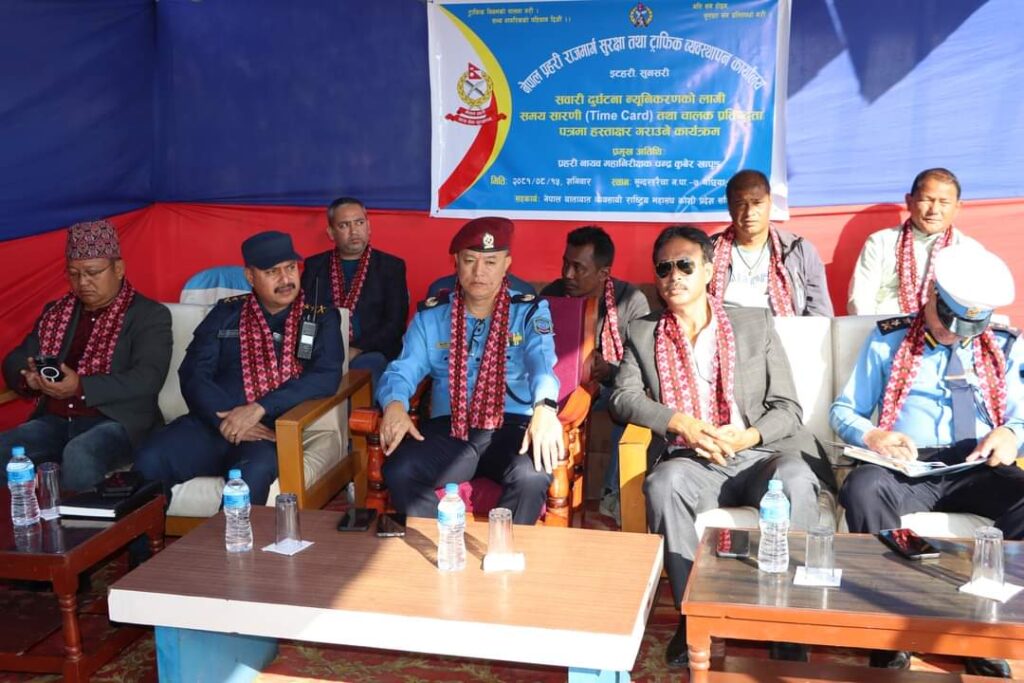 नेपाल प्रहरी राजमार्ग सुरक्षा तथा ट्राफिक व्यवस्थापन कार्यालय इटहरी प्रमुख प्रहरी उपरीक्षक बिनोद घिमिरेको अध्यक्षतामा आयोजित कार्यक्रममा कोशी प्रदेश प्रहरी प्रमुख प्रहरी नायव महानिरीक्षक चन्द्रकुवेर खापुङले प्रमुख आतिथ्यता ग्रहण गर्नु भएको थियो । कार्यक्रममा सार्वजनिक सवारी चालकहरूलाई टायमकार्डको महत्व र जिम्मेवारीबारे जानकारी दिइएको थियो भने चालकहरूले ट्राफिक नियमहरूको पालना गर्ने, निर्धारित समयतालिका अनुसार सवारी सञ्चालन गर्ने, र यात्रुहरूको सुरक्षालाई प्राथमिकता दिने प्रतिबद्धता जनाउँदै चालक प्रतिबद्धता पत्रमा हस्ताक्षर गर्नु भएको थियो ।