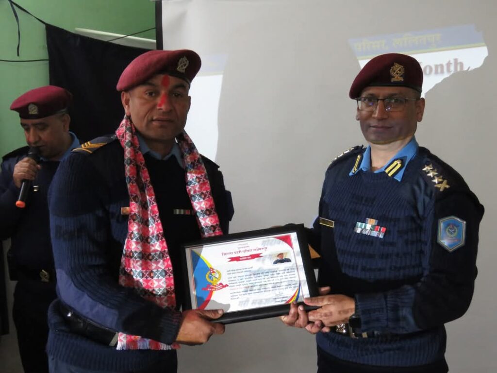 नेपाल प्रहरी संगठनले सुम्पिएको जिम्मेवारी पूर्ण रुपमा लगनशील, कर्तव्यनिष्ठ एवं विपद् व्यवस्थापन र प्रहरी कारवाहीमा प्रभावकारी भूमिका निर्वाह गर्नुका साथै सर्वसाधारण नागरिकलाई सुरक्षाको अनुभूति गराउने कार्य गरी आम नागरिकका माझ प्रहरी संगठनको गरिमामा तपाईले पुर्याउनु भएको योगदानको उच्च कदर गर्दै २०८१ साल मंसिर महिनाको “Police of The Month” को रूपमा नगद पुरस्कार सहित प्रहरी प्रभाग गोदावरी ललितपुरमा कार्यरत प्र.व.ह. सन्तोष कार्कीलाई २०८१ साल मंसिर महिनाको “Police of The Month” घोषित गरि कार्यालय प्रमुख प्रहरी वरिष्ठ उपरीक्षक शेखर खनालबाट पुरस्कार तथा प्रशंशा पत्र प्रदान गर्नुको साथै पेशा प्रति समर्पित रही,लगनशिल एवं निष्ठावान भई उत्कृष्ट ढङ्गबाट कार्यसम्पादन गर्ने निम्न २ जना प्र.क.हरु समेतलाई प्रोत्साहन स्वरुप नगद पुरस्कारद्वारा पुरस्कृत गरिएको छ ।