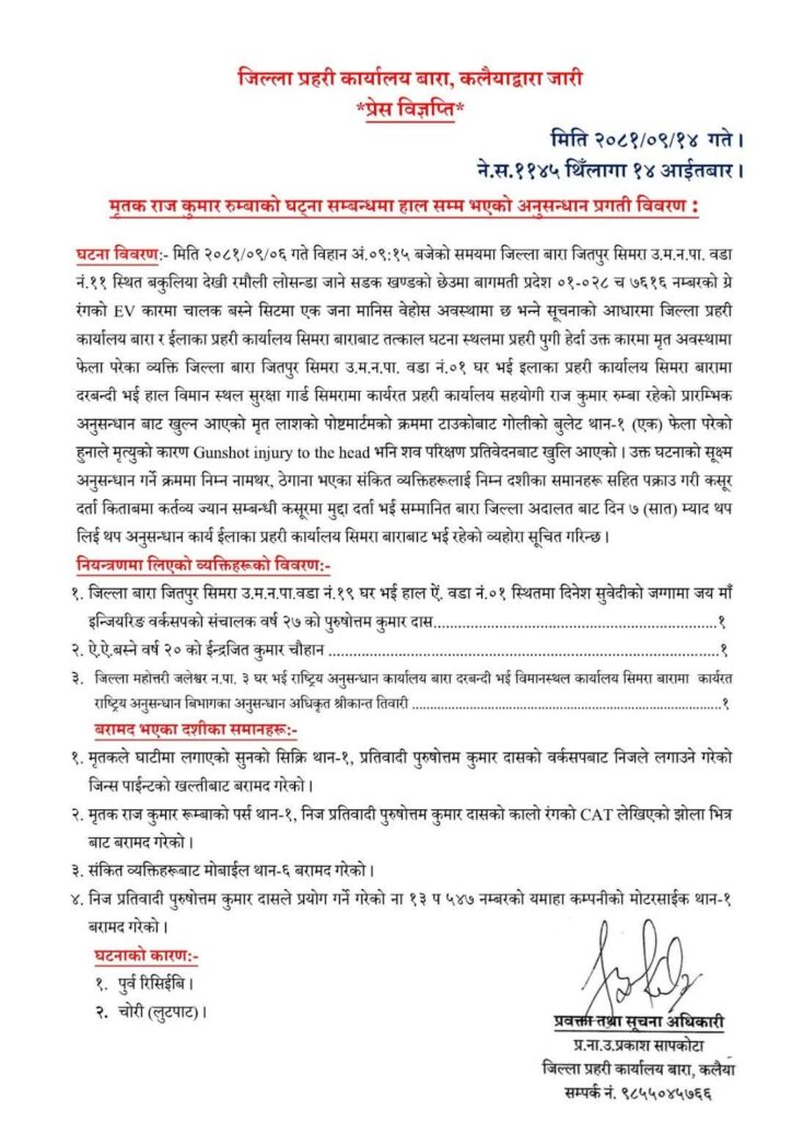 HomeAd-LandscapeAdsbar-7 प्रहरी कार्यालय सहयोगी हत्या प्रकरण : मधेश प्रदेश खवर December 29, 2024 86 0 ताजा / भरखरै प्राप्त ३ लाख ६० हजार बराबरको समान सहित पिकअप बारा प्रहरीको नियन्त्रणमा:- October 16, 2025 दरबन्दी सिरहा,कमाई बारामा: सईको तस्करी नेटवर्कलाई एसपीको साथ, October 16, 2025 सुपारी तस्करीमा सर्लाही सुरक्षाकर्मीहरुको पनि साथ:- October 16, 2025 ५० हजार बराबरको पटाका बारा प्रहरीको नियन्त्रणमा:- October 16, 2025 बंगलादेशमा सेनाका १५ वरिष्ठ अधिकारी पक्राउ काठमाडौँ । October 16, 2025 गुप्तचरका इन्स्पेक्टरसहित तीनलाई प्रहरीले सार्वजनिक गरेका छन् । Share FacebookTwitterPinterestWhatsApp Previous article“प्रतिबन्धित लागू औषध सहित १ जना महिला प्रहरीको नियन्त्रणमा”Next articleधरानको आसरा सुधार केन्द्रमा खानेपानीको चरम संकट” लोकप्रिय नागरिकता विधेयक प्रमाणीकरणप्रति राजनीतिक दलबाट मिश्रित प्रतिक्रिया, विराेधमा काठमाडाैंमा प्रदर्शन बिरगंज बाट केदारनाथ दर्शन गरी ऋषिकेश जादा ट्रक ले मिनी बसमा ठोकेको छ, भारतीय मिडिया अनुसार 2 जनाको घटनास्थलमा मृत्यु भएको छ भने 8... आज २०८०,२,१५,गते – गणतन्त्र दिवस,विभिन्न कार्यक्रम आयोजना गरी देशभर मनाइँदै,! Related Articles मधेश प्रदेश खवर - October 16, 2025३ लाख ६० हजार बराबरको समान सहित पिकअप बारा प्रहरीको नियन्त्रणमा:- मधेश प्रदेश खवर - October 16, 2025दरबन्दी सिरहा,कमाई बारामा: सईको तस्करी नेटवर्कलाई एसपीको साथ, मधेश प्रदेश खवर - October 16, 2025सुपारी तस्करीमा सर्लाही सुरक्षाकर्मीहरुको पनि साथ:-