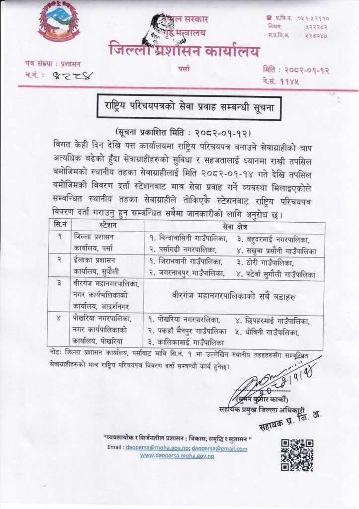 Homeप्रदेश सरकारमधेश जिल्ला प्रशासन कार्यालय पर्सा बाट राष्ट्रिय परिचयपत्र सेवा सम्बन्धि सुचना जारि गरिएको छ । मधेश प्रदेश खवर April 25, 2025 184 0 ताजा / भरखरै प्राप्त भन्सार छली गरी ल्याइँदै गरेको सामान बारा प्रहरीको नियन्त्रणमा:- April 26, 2026 राैतहट जिल्लाको सीमा क्षेत्र तस्करीमा उच्च अधिकारीको संलग्नता :- April 26, 2026 माननीय बिश्वराज पोखरेलले स्कुलका हेडसरलाई थर्काएको हो:- April 25, 2026 सुकुम्बासी अतिक्रमण व्यवस्थापन गर्न उपत्यका सुरक्षा प्रमुखद्वारा निरीक्षण:- April 25, 2026 सिमानाकामा सशस्त्र प्रहरीको तस्करीमा कडाइ:सरकारको अनिवार्यमा विरोध:- April 24, 2026 Share FacebookTwitterPinterestWhatsApp Previous articleसशस्त्र प्रहरीद्वारा भन्सार छली औषधिसहित अमृत पक्राउ:-Next articleसशस्त्र प्रहरीद्वारा भन्सार काटिएको पिकप माछासहित भन्सार बुझाइयो:- लोकप्रिय नागरिकता विधेयक प्रमाणीकरणप्रति राजनीतिक दलबाट मिश्रित प्रतिक्रिया, विराेधमा काठमाडाैंमा प्रदर्शन बिरगंज बाट केदारनाथ दर्शन गरी ऋषिकेश जादा ट्रक ले मिनी बसमा ठोकेको छ, भारतीय मिडिया अनुसार 2 जनाको घटनास्थलमा मृत्यु भएको छ भने 8... आज २०८०,२,१५,गते – गणतन्त्र दिवस,विभिन्न कार्यक्रम आयोजना गरी देशभर मनाइँदै,! Related Articles मधेश प्रदेश खवर - April 26, 2026भन्सार छली गरी ल्याइँदै गरेको सामान बारा प्रहरीको नियन्त्रणमा:- मधेश प्रदेश खवर - April 26, 2026राैतहट जिल्लाको सीमा क्षेत्र तस्करीमा उच्च अधिकारीको संलग्नता :- मधेश प्रदेश खवर - April 25, 2026माननीय बिश्वराज पोखरेलले स्कुलका हेडसरलाई थर्काएको हो:-