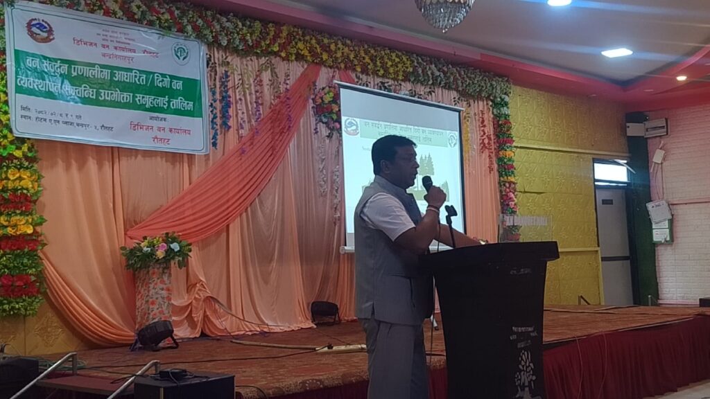 रौतहटको चन्द्रनिगाहपुरस्थित एएन प्लाजा होटलमा डिभिजन वन कार्यालयको आयोजनामा “वन संरक्षण प्रणालीमा आधारित दिगो वन व्यवस्थापन” सम्बन्धी तालिम सुरु भएको छ। दुई दिनसम्म चल्ने यो तालिम सामुदायिक वन उपभोक्ता समूहका पदाधिकारीहरूलाई लक्षित गरी सञ्चालन गरिएको हो।