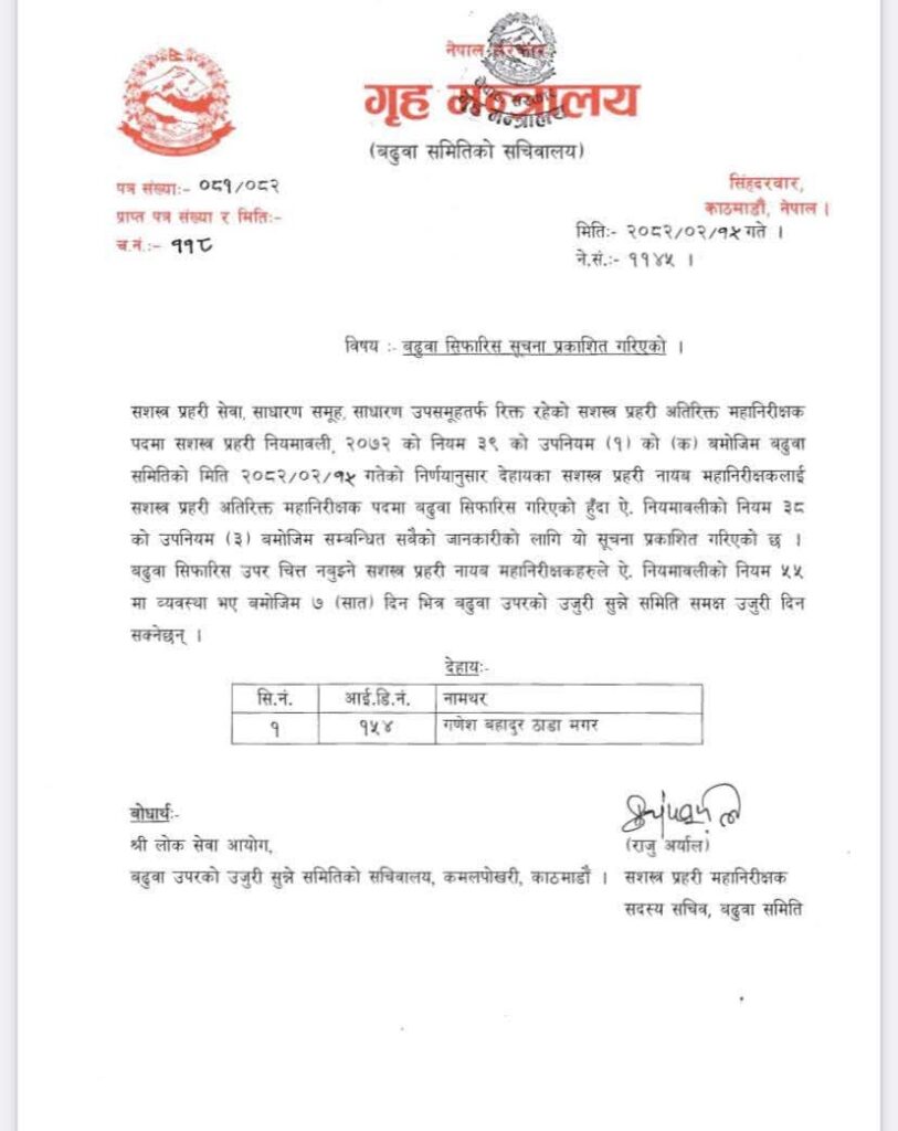 सशस्त्र प्रहरी बल, नेपालका (डीआईजी) गणेश बहादुर ठाडा मगर एआईजीमा बढुवा सिफारिस भएका छन् । हिजो,बिहीबार गृह मन्त्रालयका सचिव गोकर्णमणी दुवाडीको नेतृत्वमा बसेको बढुवा समितिले उनलाई एआईजीमा बढुवा सिफारिस गरेको हो ।