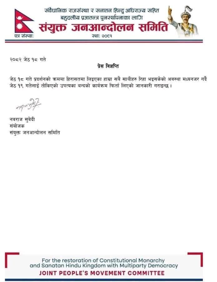 राजसंस्था र हिन्दु राज्य पुनर्स्थापनाको मागसहित आन्दोलनरत संयुक्त जनआन्दोलन समितिले काठमाडौं उपत्यका बन्दको कार्यक्रम फिर्ता लिएको जनाएको छ । आन्दोलनको कार्यक्रममा पक्राउ परेका सबै रिहा भइसकेकाले जेठ १९ गतेलाई तोकिएको बन्दको कार्यक्रम फिर्ता लिइएका छन् ।