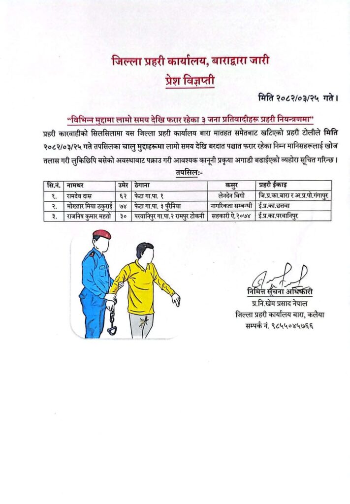 Homeप्रदेश सरकारमधेश मधेश प्रदेश खवर July 13, 2025 156 0 ताजा / भरखरै प्राप्त “तारा” बोकेर सामाजिक न्यायको एजेन्डासहित मैदानमा February 2, 2026 बिहारमा २५ लाख नक्कली नोटसहित १० जना भारतिय प्रहरीद्वारा पक्राउ:- February 1, 2026 मकवानपुर प्रहरीद्वारा खैरो हेरोइन र ट्रामाडोलसहित सात जना पक्राउ:- February 1, 2026 २०२६ मा सहभागीहुने प्रहरीको महिलाभलिबल टोलिलाई आईजीपी गरे बिदाइ:- February 1, 2026 नवाजको ५ विकेटमा अस्ट्रेलियासँगको शृंखला पाकिस्तानले गर्यो ‘क्लिन-स्वीप’ February 1, 2026 Share FacebookTwitterPinterestWhatsApp Previous articleNext article लोकप्रिय नागरिकता विधेयक प्रमाणीकरणप्रति राजनीतिक दलबाट मिश्रित प्रतिक्रिया, विराेधमा काठमाडाैंमा प्रदर्शन बिरगंज बाट केदारनाथ दर्शन गरी ऋषिकेश जादा ट्रक ले मिनी बसमा ठोकेको छ, भारतीय मिडिया अनुसार 2 जनाको घटनास्थलमा मृत्यु भएको छ भने 8... आज २०८०,२,१५,गते – गणतन्त्र दिवस,विभिन्न कार्यक्रम आयोजना गरी देशभर मनाइँदै,! Related Articles मधेश प्रदेश खवर - February 2, 2026“तारा” बोकेर सामाजिक न्यायको एजेन्डासहित मैदानमा मधेश प्रदेश खवर - February 1, 2026बिहारमा २५ लाख नक्कली नोटसहित १० जना भारतिय प्रहरीद्वारा पक्राउ:- मधेश प्रदेश खवर - February 1, 2026मकवानपुर प्रहरीद्वारा खैरो हेरोइन र ट्रामाडोलसहित सात जना पक्राउ:-