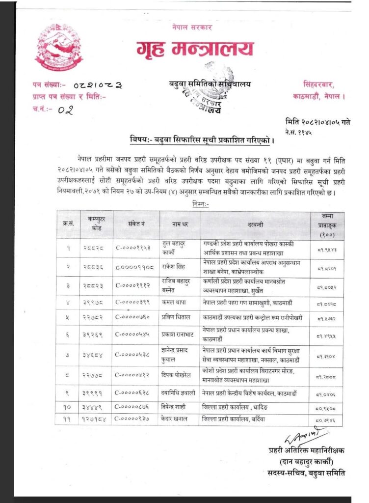 Homeप्रदेश सरकारबागमती नेपाल प्रहरीका ११ जना (एसपी)(एसएसपी)मा बढुवा सिफारिस:- मधेश प्रदेश खवर July 21, 2025 254 0 ताजा / भरखरै प्राप्त लागु औषधसहित कञ्चनपुरबाट एकै दिनमा ६ जना प्रहरीद्वरा पक्राउ:- April 20, 2026 पर्सा जिल्लाको वीरगञ्जमा सरकारको आर्थिक नीतिको विरोध:- April 19, 2026 चार थान पेस्तोल र ५८ राउण्ड गोली बिष्णुमति खोला किनारमा फेला:- April 19, 2026 वीरगञ्जको मुरली टोल सडक विस्तारका लागि २४ घण्टेअल्टिमेटम,व्यवसायी चिन्तित:- April 19, 2026 १३ वर्षपछिको प्रतीक्षा अन्त्यस् वीरगन्जको लाइफलाइन’मानिने मुख्य सडक विस्तार सुरु:- April 19, 2026 नेपाल प्रहरीका ११ जना प्रहरी उपरीक्षक (एसपी) प्रहरी वरिष्ठ उपरीक्षक (एसएसपी) मा बढुवा सिफारिस हुन भएका छन् । Share FacebookTwitterPinterestWhatsApp Previous articleविमलेशको हत्या आरोपमा २४ वर्षकी जुली झा पक्राउ:-Next articleनेपाल प्रहरीका ३५ जाना एसपी डीएसपी र इन्स्पेक्टरको बढुवा:- लोकप्रिय नागरिकता विधेयक प्रमाणीकरणप्रति राजनीतिक दलबाट मिश्रित प्रतिक्रिया, विराेधमा काठमाडाैंमा प्रदर्शन बिरगंज बाट केदारनाथ दर्शन गरी ऋषिकेश जादा ट्रक ले मिनी बसमा ठोकेको छ, भारतीय मिडिया अनुसार 2 जनाको घटनास्थलमा मृत्यु भएको छ भने 8... आज २०८०,२,१५,गते – गणतन्त्र दिवस,विभिन्न कार्यक्रम आयोजना गरी देशभर मनाइँदै,! Related Articles मधेश प्रदेश खवर - April 20, 2026लागु औषधसहित कञ्चनपुरबाट एकै दिनमा ६ जना प्रहरीद्वरा पक्राउ:- मधेश प्रदेश खवर - April 19, 2026पर्सा जिल्लाको वीरगञ्जमा सरकारको आर्थिक नीतिको विरोध:- मधेश प्रदेश खवर - April 19, 2026चार थान पेस्तोल र ५८ राउण्ड गोली बिष्णुमति खोला किनारमा फेला:-