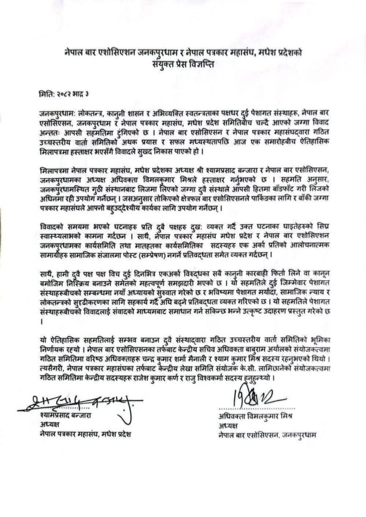 Homeप्रदेश सरकारमधेश नेपाल पत्रकार महासंघ र नेपाल बार एसोसिएसन जनकपुर बीच सहमति:- मधेश प्रदेश खवर August 20, 2025 158 0 ताजा / भरखरै प्राप्त मकवानपुर प्रहरीद्वारा १७२ किलो गाँजासहितको पिकअप बरामद:- February 2, 2026 “तारा” बोकेर सामाजिक न्यायको एजेन्डासहित मैदानमा February 2, 2026 बिहारमा २५ लाख नक्कली नोटसहित १० जना भारतिय प्रहरीद्वारा पक्राउ:- February 1, 2026 मकवानपुर प्रहरीद्वारा खैरो हेरोइन र ट्रामाडोलसहित सात जना पक्राउ:- February 1, 2026 २०२६ मा सहभागीहुने प्रहरीको महिलाभलिबल टोलिलाई आईजीपी गरे बिदाइ:- February 1, 2026 Share FacebookTwitterPinterestWhatsApp Previous articleसशस्त्र प्रहरी पर्साद्वारा ६१५ लिटर घरेलु मदिरा बरामद:-Next articleजिल्ला प्रहरी परिसर, काठमाडौंको अनुगमन तथा निरीक्षण सम्पन्न:- लोकप्रिय नागरिकता विधेयक प्रमाणीकरणप्रति राजनीतिक दलबाट मिश्रित प्रतिक्रिया, विराेधमा काठमाडाैंमा प्रदर्शन बिरगंज बाट केदारनाथ दर्शन गरी ऋषिकेश जादा ट्रक ले मिनी बसमा ठोकेको छ, भारतीय मिडिया अनुसार 2 जनाको घटनास्थलमा मृत्यु भएको छ भने 8... आज २०८०,२,१५,गते – गणतन्त्र दिवस,विभिन्न कार्यक्रम आयोजना गरी देशभर मनाइँदै,! Related Articles मधेश प्रदेश खवर - February 2, 2026मकवानपुर प्रहरीद्वारा १७२ किलो गाँजासहितको पिकअप बरामद:- मधेश प्रदेश खवर - February 2, 2026“तारा” बोकेर सामाजिक न्यायको एजेन्डासहित मैदानमा मधेश प्रदेश खवर - February 1, 2026बिहारमा २५ लाख नक्कली नोटसहित १० जना भारतिय प्रहरीद्वारा पक्राउ:-