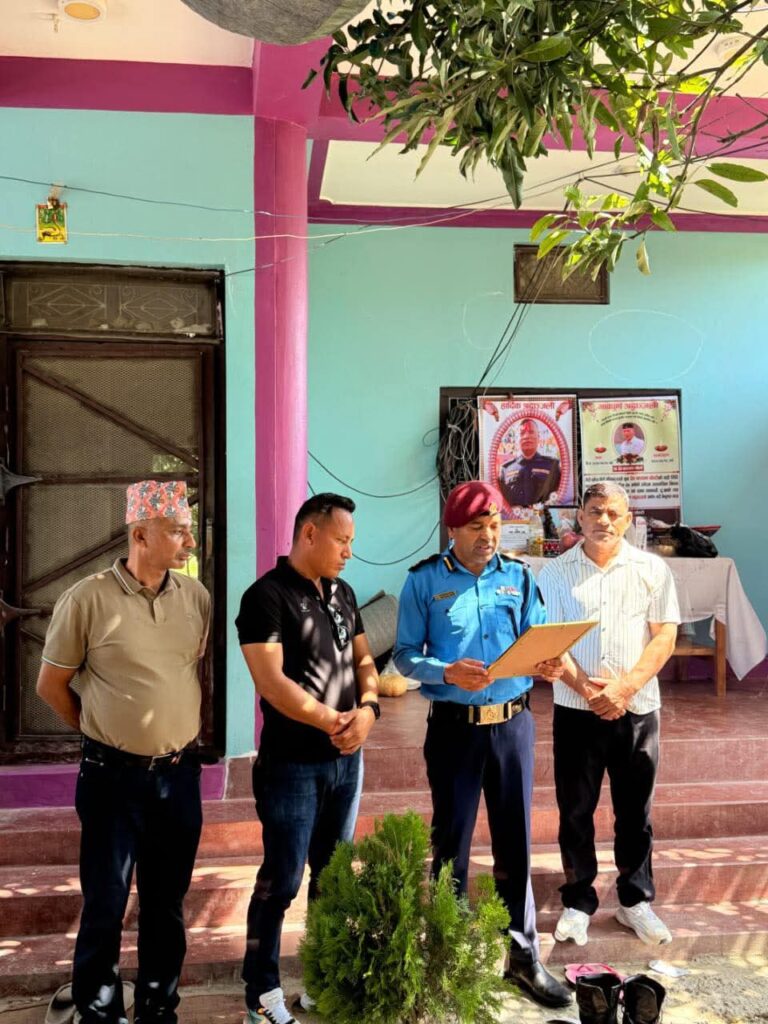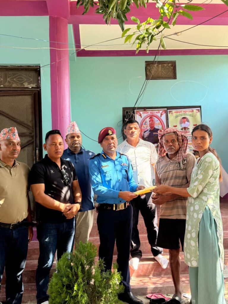 प्र.चौ. कपुरकोट सल्यानमा कार्यरत स्वर्गिय प्र.स.नि. देवनारायण चौधरीको असमयिक निधन प्रति सिसनिया-२ दाङ घरमा गई यस कार्यालयका कार्यालय प्रमुख प्रहरी नायव उपरीक्षक डा. हेम बहादुर के.सी. ज्युले सम्पुर्ण प्रहरी कर्मचारीहरुबाट आर्थिक संकल दान तथा भेटी स्वरुप संकलन गरी रकम रू १,०२,०६५।-( एक लाख दुई हजार पैसठ्ठी रूपैयाँ) निजको बुवा तथा छोरीलाई हस्तान्तरण गर्नु भएको छ ।