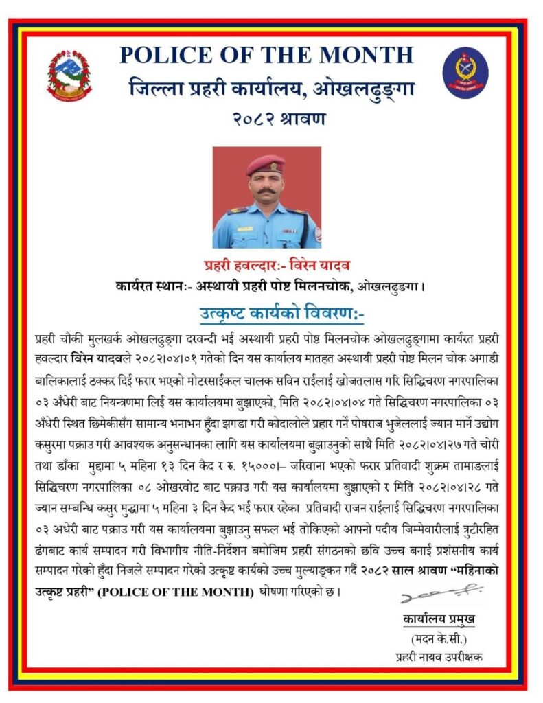 Homeप्रदेश सरकारगण्डकी साउन महिना २०८२/को उत्कृष्ट प्रहरी घोषित:- मधेश प्रदेश खवर September 2, 2025 58 0 ताजा / भरखरै प्राप्त सिरहामा यात्रुबाहक बसबाट लडेर सह–चालकको मृत्यु:- October 9, 2025 काठमाडौँको माइतीघर मण्डलामा बाक्लो प्रहरी परिचालन:- October 9, 2025 प्रहरीको दाँत झारदिने वडाध्यक्ष छोटेलाल प्रहरीद्वारा पक्राउ:- October 8, 2025 जात्रामा बाजा बजाउँदै नेवार समुदायहाडिगाँउ जात्रामा ब्रह्मा, विष्णु र महेश्वर भगवानको पूजा आराधना गरी रथलाई हाडिगाँउ घुमाउने क्रममा बाजा बजाउँदै नेवार समुदाय । हरेक... October 8, 2025 ७८ लाख घुस डिल अडियो सार्वजनिक प्रकरण:- October 8, 2025 Share FacebookTwitterPinterestWhatsApp Previous articleदौड प्रतियोगितामा प्रथम हुने खेलाडी पुरस्कृतप्रधान सेनापति अशोकराज सिग्देल मङ्गलबार भद्रकालीस्थित नेपाली सेनाको खेल मैदानमा नेपाली सेनाद्बारा आयोजित ‘प्रधान सेनापति ट्रफी २०८२’ को उद्घाटन कार्यक्रममा पुरूष तर्फको १५०० मिटर दौड प्रतियोगितामा प्रथम हुने खेलाडीलाई पुरस्कार प्रदान गर्नुहुँदै ।तस्बिरः रत्न श्रेष्ठ,रासस/Next articleअझ घर पोर्कन सकेनन् कञ्चनपुरका बाडी विस्थापित:- लोकप्रिय नागरिकता विधेयक प्रमाणीकरणप्रति राजनीतिक दलबाट मिश्रित प्रतिक्रिया, विराेधमा काठमाडाैंमा प्रदर्शन बिरगंज बाट केदारनाथ दर्शन गरी ऋषिकेश जादा ट्रक ले मिनी बसमा ठोकेको छ, भारतीय मिडिया अनुसार 2 जनाको घटनास्थलमा मृत्यु भएको छ भने 8... आज २०८०,२,१५,गते – गणतन्त्र दिवस,विभिन्न कार्यक्रम आयोजना गरी देशभर मनाइँदै,! Related Articles मधेश प्रदेश खवर - October 9, 2025सिरहामा यात्रुबाहक बसबाट लडेर सह–चालकको मृत्यु:- मधेश प्रदेश खवर - October 9, 2025काठमाडौँको माइतीघर मण्डलामा बाक्लो प्रहरी परिचालन:- मधेश प्रदेश खवर - October 8, 2025प्रहरीको दाँत झारदिने वडाध्यक्ष छोटेलाल प्रहरीद्वारा पक्राउ:-
