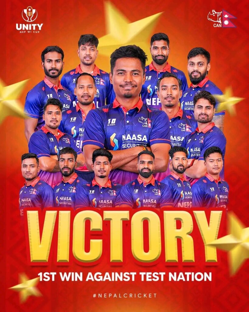नेपालले वेस्ट इन्डिजलाई १९ रनले हराउँदै ऐतिहासिक जित दर्ता गरेको छ । ❤️😍