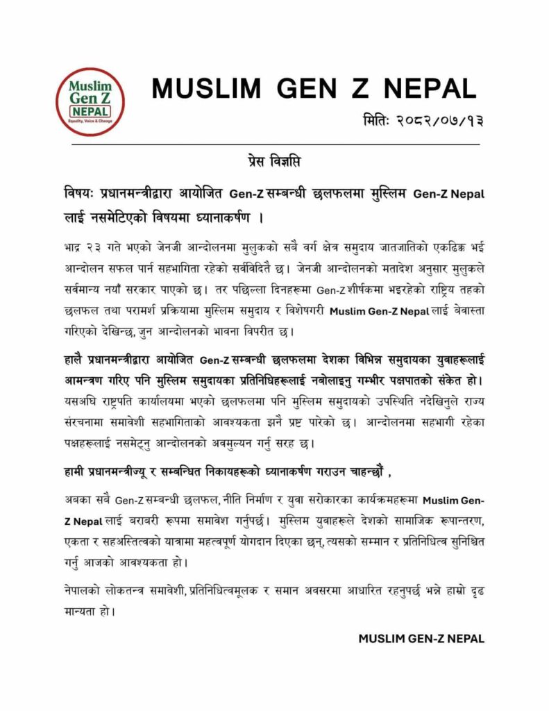 Homeप्रदेश सरकारबागमती प्रधानमन्त्रीद्वारा आयोजित Gen-Z सम्बन्धी छलफलमा मुस्लिम समुदायका युवाहरूलाई समावेश नगरेको विषयप्रति Muslim Gen Z Nepal ले गम्भीर ध्यानाकर्षण गराएको छ। मधेश प्रदेश खवर October 30, 2025 51 0 ताजा / भरखरै प्राप्त बाटोका हिउँ पन्छाउंदै सशस्त्र प्रहरी बल नं. ३३ गुल्म मुस्ताङ:- October 30, 2025 गैरहाजिर १५ प्रहरीमाथि कारबाहीको चेतावनी: October 30, 2025 मुस्ताङको मुक्तिनाथ क्षेत्रमा भारि मात्रामा हिमपात:- October 30, 2025 नेता आलमको स्वास्थ्य अवस्थामा गम्भीर भेन्टिलेटरमा उपचार हुदै:- October 30, 2025 सशस्त्र प्रहरी निरीक्षक पदको अन्तर्वार्ता परीक्षा सम्बन्धी सूचना:- October 30, 2025 संगठनले बुधबार एक विज्ञप्ति सार्वजनिक गर्दै यस्तो निर्णयले मुस्लिम समुदायप्रति राज्यको दृष्टिकोणमा प्रश्न उठाएको जनाएको छ । Share FacebookTwitterPinterestWhatsApp Previous articleगैरहाजिर १५ प्रहरीमाथि कारबाहीको चेतावनी:Next articleबाटोका हिउँ पन्छाउंदै सशस्त्र प्रहरी बल नं. ३३ गुल्म मुस्ताङ:- लोकप्रिय नागरिकता विधेयक प्रमाणीकरणप्रति राजनीतिक दलबाट मिश्रित प्रतिक्रिया, विराेधमा काठमाडाैंमा प्रदर्शन बिरगंज बाट केदारनाथ दर्शन गरी ऋषिकेश जादा ट्रक ले मिनी बसमा ठोकेको छ, भारतीय मिडिया अनुसार 2 जनाको घटनास्थलमा मृत्यु भएको छ भने 8... आज २०८०,२,१५,गते – गणतन्त्र दिवस,विभिन्न कार्यक्रम आयोजना गरी देशभर मनाइँदै,! Related Articles मधेश प्रदेश खवर - October 30, 2025बाटोका हिउँ पन्छाउंदै सशस्त्र प्रहरी बल नं. ३३ गुल्म मुस्ताङ:- मधेश प्रदेश खवर - October 30, 2025गैरहाजिर १५ प्रहरीमाथि कारबाहीको चेतावनी: मधेश प्रदेश खवर - October 30, 2025मुस्ताङको मुक्तिनाथ क्षेत्रमा भारि मात्रामा हिमपात:-