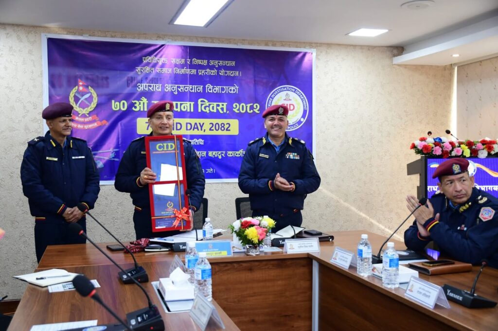 कार्यक्रममा प्रहरी महानिरीक्षक दान बहादुर कार्कीले अपराध अनुसन्धान विभागका पूर्व प्रमुख एवम् अवकाश प्राप्त प्रहरी अतिरिक्त महानिरीक्षक सुरेन्द्र बहादुर शाहलाई सम्मान गर्नुभयो । साथै उहाँले अपराध अनुसन्धान विभागद्वारा प्राकाशित CID Magazine, 2082 को विमोचन समेत गर्नुभयो ।