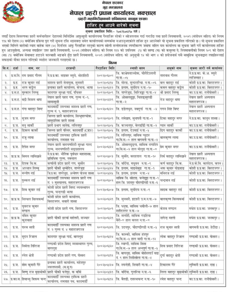 भदौ र असोज महिनाका विभिन्न मितिमा बिदा लिएर बिदा सकिँदा पनि कार्यालयमा हाजिर नभए पछि प्रहरी प्रधान कार्यालयले सूचना जारी गरेको जनाइएको छ ।