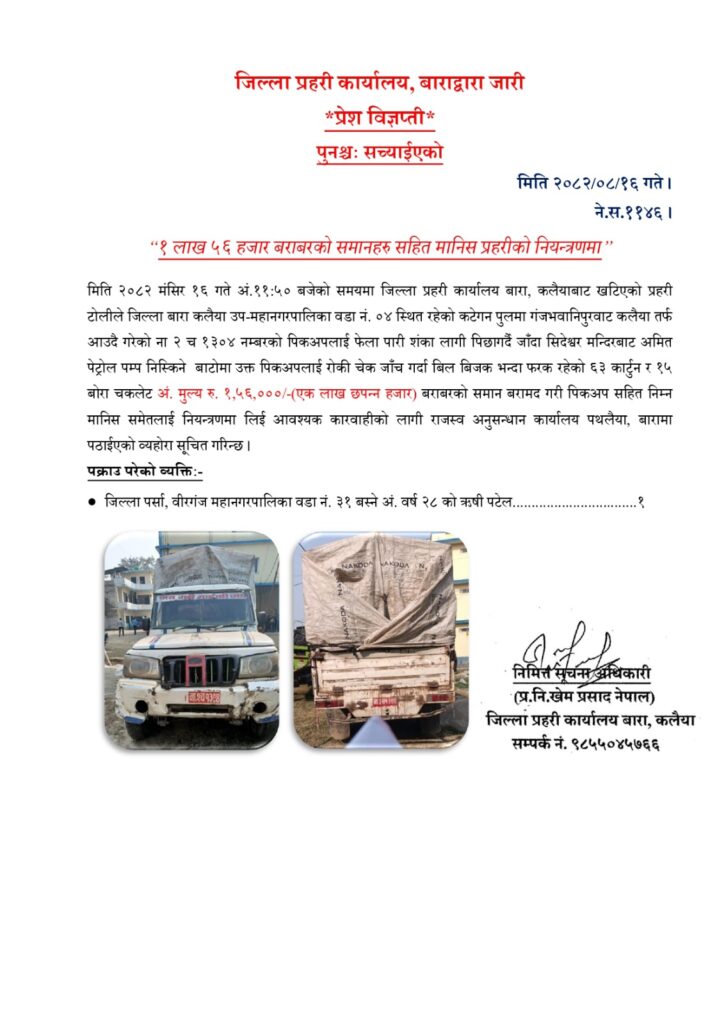 मिति २०८२ मंसिर १६ गते अं.११:५० बजेको समयमा जिल्ला प्रहरी कार्यालय बाराको कलैयाबाट खटिएको प्रहरी टोलीले जिल्ला बारा कलैया उप-महानगरपालिका वडा नं. ०४ स्थित रहेको कटेगन पुलमा गंजभवानिपुरवाट कलैया तर्फ आउदै गरेको ना २ च १३०४ नम्बरको पिकअपलाई फेला पारी शंका लागी पिछागर्दै जाँदा सिदेश्वर मन्दिरबाट अमित पेट्रोल पम्प निस्किने बाटोमा उक्त पिकअपलाई रोकी चेक जाँच गर्दा बिल बिजक भन्दा फरक रहेको ६३ कार्टुन र १५ बोरा चकलेट मुल्य रु. १,५६,०००, (एक लाख छपन्न हजार) बराबरको समान बरामद गरी पिकअप र मानिससहितलाई नियन्त्रणमा लिई आवश्यक कारवाहीको लागी राजस्व अनुसन्धान कार्यालय बाराको राजस्वको कार्यालय पथलैयामा बुझाएको बारा प्रहरीले जनाएको छ ।