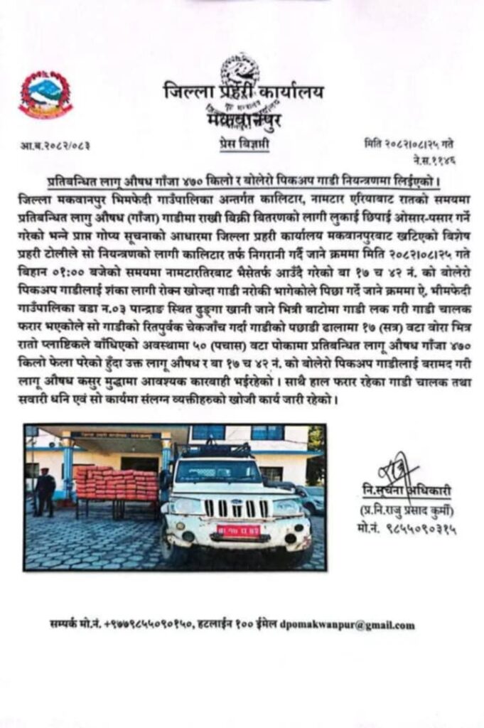 मकवानपुरका प्रहरीले प्रतिबन्धित लागू औषध गाँजा ४७० किलो बोकेको बोलेरो पिकअप गाडी बरामद गरेको प्रहरीले जनाएको छ । प्रहरीका अनुसार गोप्य सूचनाका आधारमा गरिएको अभियान क्रममा प्रहरीले गाडी सहित ठूलो परिमाणको गाँजा नियन्त्रणमा लिएको हो। घटनासम्बन्धी आवश्यक अनुसन्धान अघि बढाइएको मकवानपुरका प्रहरीले जनाएको छ।