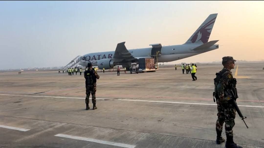 हाम्रो नेपालले कतारलाई उपहारस्वरूप दिएका दुई हात्ती रुद्रकली र खगेन्द्रप्रसादलाई कतार एयरवेजको कार्गो विमानमा रुपन्देहीको भैरहवास्थित अन्तराष्ट्रिय विमानस्थलमा लोड गरिदै गरेको तस्बिर।