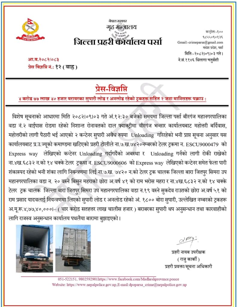 प्रहरीले दुई वटा कन्टेनरमा लोड गरिएको सुपारी तथा गोदामभित्र भण्डारण गरिएको अन्दाजी ९ सय बोरा सुपारी नियन्त्रणमा लिई थप अनुसन्धान अघि बढाएको पर्साका प्रहरी प्रमुखले जनाएको छन् ।