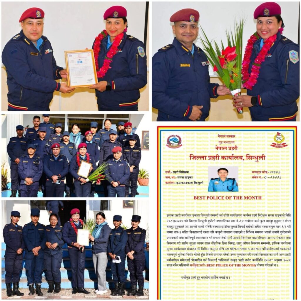 सिन्धुली । साहसिक प्रहरीकार्य गर्ने प्रहरी निरीक्षक सपना खड्कालाई जिल्ला प्रहरी कार्यालय सिन्धुलीले मंसिर महिनाको उत्कृष्ट प्रहरी छनौट गरेको जनाइएको छ ।