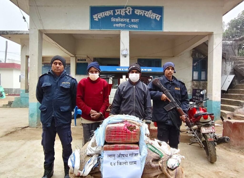 इलाका प्रहरी कार्य बाराका प्रहरी प्रमुख कृष्ण देव प्रसाद साह प्रहरी निरीक्षकले ६४ किलो ४.५० ग्राम लागु औषध र दुई जना मानिससहित बारा प्रहरीले पक्राउ गरेको हो निरीक्षकले जानकारी दिएको छन् ।