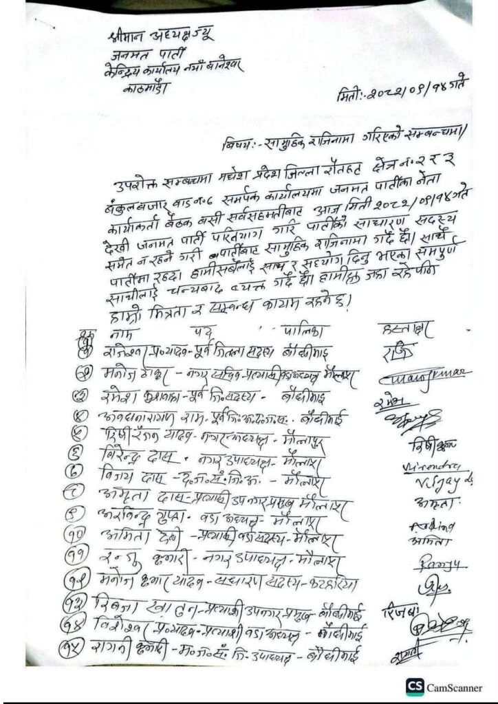 रौतहट जिल्ला बाट १०४ जना जनमत पार्टीको नेताकार्यकर्ताले सामुहिक राजीनामा दिएका छन ।