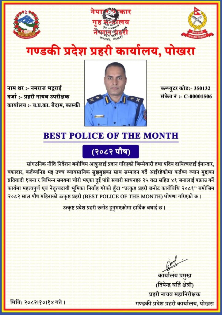 Homeप्रदेश सरकारगण्डकी डिएसपी नमराज भट्टराई बने प्रदेशकै उत्कृष्ट प्रहरी:- मधेश प्रदेश खवर January 30, 2026 139 0 ताजा / भरखरै प्राप्त बिहारमा २५ लाख नक्कली नोटसहित १० जना भारतिय प्रहरीद्वारा पक्राउ:- February 1, 2026 मकवानपुर प्रहरीद्वारा खैरो हेरोइन र ट्रामाडोलसहित सात जना पक्राउ:- February 1, 2026 २०२६ मा सहभागीहुने प्रहरीको महिलाभलिबल टोलिलाई आईजीपी गरे बिदाइ:- February 1, 2026 नवाजको ५ विकेटमा अस्ट्रेलियासँगको शृंखला पाकिस्तानले गर्यो ‘क्लिन-स्वीप’ February 1, 2026 महोत्तरीको खयरबनी नाकासुरक्षा निकायकै छत्रछायाँमा तीन सातादेखि करोडौँको तस्करी: February 1, 2026 नेपाल प्रहरी नायब उपरिक्षक (डिएसपी) नमराज भट्टराई गण्डकी प्रदेशकै उत्कृष्ट प्रहरी घोषित भएको छन् । Share FacebookTwitterPinterestWhatsApp Previous articleपरवानीपुर हत्या काण्ड, मृतककी पत्नी र प्रेमी बारा प्रहरीद्वारा पक्राउ:-Next articleराैतहटको सीमावर्ती क्षेत्रहरुमा सशस्त्रको मिलेमतोमा व्यापक तस्करी:- लोकप्रिय नागरिकता विधेयक प्रमाणीकरणप्रति राजनीतिक दलबाट मिश्रित प्रतिक्रिया, विराेधमा काठमाडाैंमा प्रदर्शन बिरगंज बाट केदारनाथ दर्शन गरी ऋषिकेश जादा ट्रक ले मिनी बसमा ठोकेको छ, भारतीय मिडिया अनुसार 2 जनाको घटनास्थलमा मृत्यु भएको छ भने 8... आज २०८०,२,१५,गते – गणतन्त्र दिवस,विभिन्न कार्यक्रम आयोजना गरी देशभर मनाइँदै,! Related Articles मधेश प्रदेश खवर - February 1, 2026बिहारमा २५ लाख नक्कली नोटसहित १० जना भारतिय प्रहरीद्वारा पक्राउ:- मधेश प्रदेश खवर - February 1, 2026मकवानपुर प्रहरीद्वारा खैरो हेरोइन र ट्रामाडोलसहित सात जना पक्राउ:- मधेश प्रदेश खवर - February 1, 2026२०२६ मा सहभागीहुने प्रहरीको महिलाभलिबल टोलिलाई आईजीपी गरे बिदाइ:-