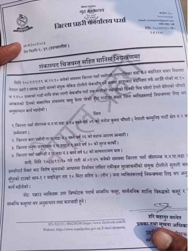 बमसहित नेपाली कम्युनिस्ट पार्टी पर्सा क्षेत्र २ का उम्मेदवार मनोज चौधरी पर्सा प्रहरीद्वारा पक्राउ परेका छन् ।