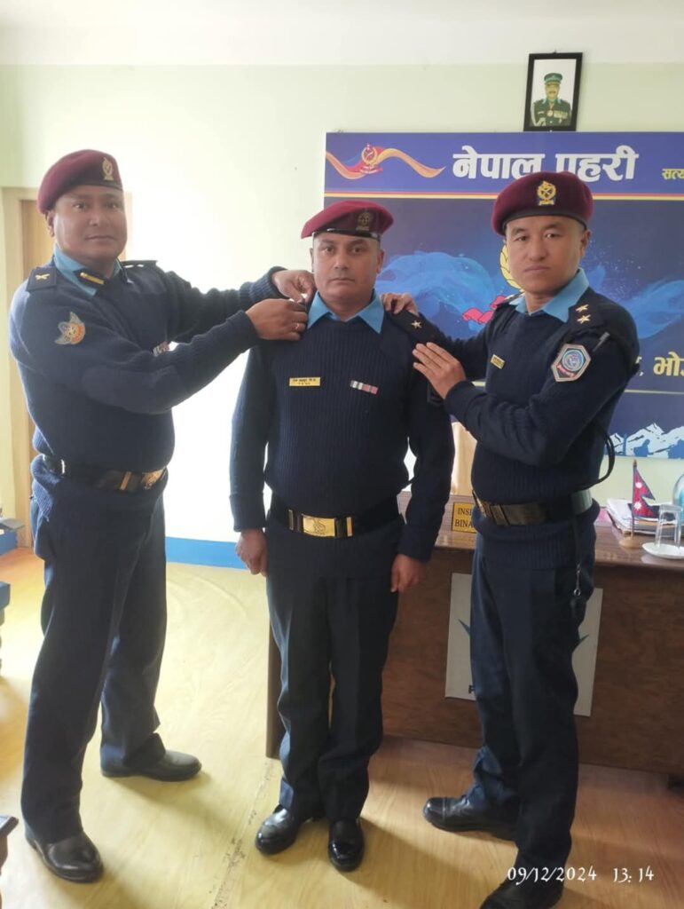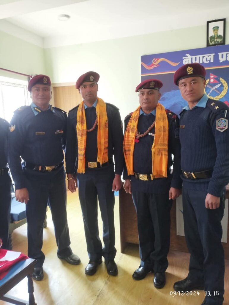 (क.प्र. शाखा) नक्साल काठमाडौको चलानी नम्बर ३००५ मिति २०८१।०८।२१ गतेको पत्र आदेशानुसार प्रहरी अतिरिक्त महानिरिक्षकको मिति २०८१।०८।१७ गतेको निर्णय अनुसार जनपद प्रहरी बरिष्ट हवल्दार पदबाट प्रहरी सहायक निरिक्षक पदमा वढुवा भएका प्रहरी सहायक निरिक्षक टेक बहादुर बिक र प्रहरी सहायक निरिक्षक गुलाफ चन्द्र सरदार थारुलाई इलाका प्रहरी कार्यालय दिङला भोजपुरका कार्यालय प्रमुख प्रहरी निरिक्षक बिनय कुमार सिंहले दज्यार्नी चिन्हद्वारा शुसोभन गर्नु भई पदोन्ती हुनु भएका प्रहरी सहायक निरिक्षकहरुलाई बधाई तथा शुभकामना दिनु हुदै थप जिम्मेवारी वढेसंगै आफ्नो कर्तव्य उत्कृष्ट ढङगले निर्वाह गर्न समेत निर्देशन दिनु भएको छ।