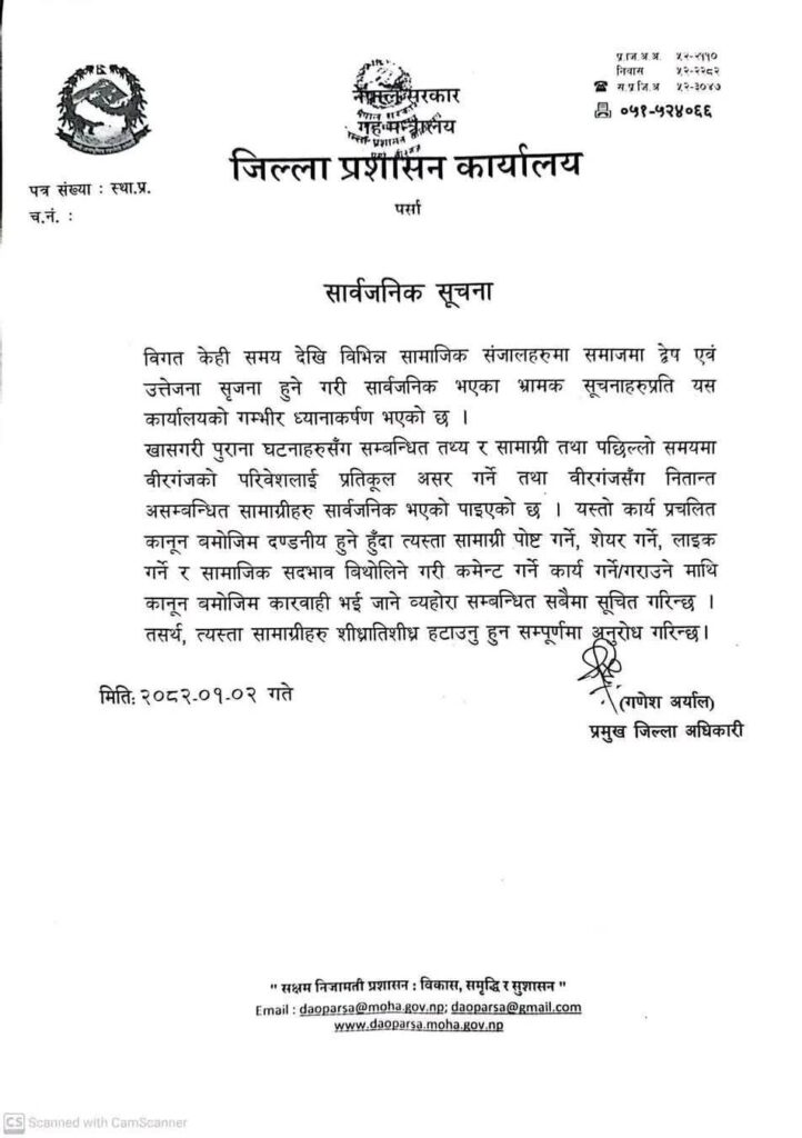 Homeप्रदेश सरकारमधेश जिल्ला प्रशासन कार्यालय पर्साले सामाजिक सञ्जालमा समाजमा द्वेष, उत्तेजना र तनाव फैलाउने भ्रामक सामग्रीहरू नपोस्ट गर्न, नसेयर गर्न, लाइक वा कमेन्ट समेत नगर्न सर्वसाधारणमा अपील गरेको छ। मधेश प्रदेश खवर April 15, 2025 158 0 ताजा / भरखरै प्राप्त पर्सा जिल्लाको वीरगञ्जमा सरकारको आर्थिक नीतिको विरोध:- April 19, 2026 चार थान पेस्तोल र ५८ राउण्ड गोली बिष्णुमति खोला किनारमा फेला:- April 19, 2026 वीरगञ्जको मुरली टोल सडक विस्तारका लागि २४ घण्टेअल्टिमेटम,व्यवसायी चिन्तित:- April 19, 2026 १३ वर्षपछिको प्रतीक्षा अन्त्यस् वीरगन्जको लाइफलाइन’मानिने मुख्य सडक विस्तार सुरु:- April 19, 2026 सशस्त्र प्रहरी पर्साद्वारा लाखोको केरा र किराना समान बरामद:- April 19, 2026 Share FacebookTwitterPinterestWhatsApp Previous articleपर्साका बिरगंज महानगरमा तनाव:-Next articleसशस्त्र प्रहरी महानिरीक्षक (आईजीपी(राजु अर्यालले बैशाख आज २ गते प्रधान कार्यालय हलचोक स्वयम्भुममा अनिवार्य अवकाश जान लाग्नुभएका सशस्त्र प्रहरी अतरिक्त महानिरीक्षक(एआईजी) चन्द्रप्रकाश गौतम ज्युलाई विदाई गर्नुभएको छ । लोकप्रिय नागरिकता विधेयक प्रमाणीकरणप्रति राजनीतिक दलबाट मिश्रित प्रतिक्रिया, विराेधमा काठमाडाैंमा प्रदर्शन बिरगंज बाट केदारनाथ दर्शन गरी ऋषिकेश जादा ट्रक ले मिनी बसमा ठोकेको छ, भारतीय मिडिया अनुसार 2 जनाको घटनास्थलमा मृत्यु भएको छ भने 8... आज २०८०,२,१५,गते – गणतन्त्र दिवस,विभिन्न कार्यक्रम आयोजना गरी देशभर मनाइँदै,! Related Articles मधेश प्रदेश खवर - April 19, 2026पर्सा जिल्लाको वीरगञ्जमा सरकारको आर्थिक नीतिको विरोध:- मधेश प्रदेश खवर - April 19, 2026चार थान पेस्तोल र ५८ राउण्ड गोली बिष्णुमति खोला किनारमा फेला:- मधेश प्रदेश खवर - April 19, 2026वीरगञ्जको मुरली टोल सडक विस्तारका लागि २४ घण्टेअल्टिमेटम,व्यवसायी चिन्तित:-