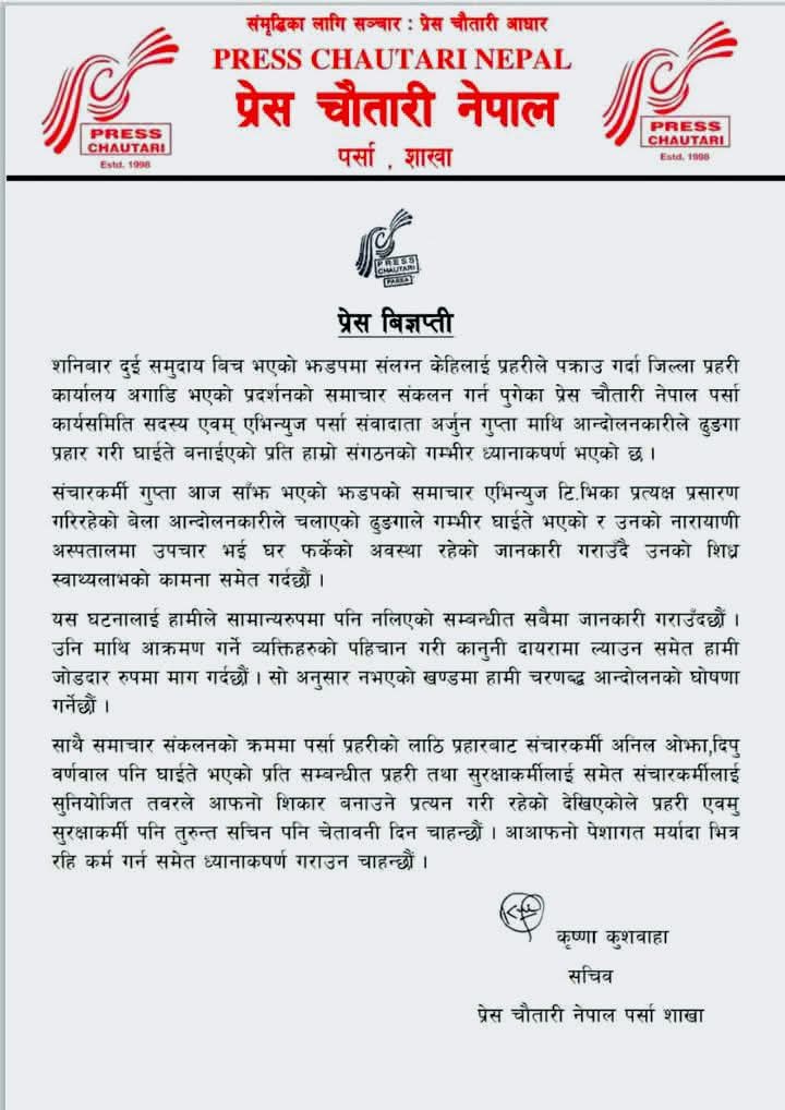 Homeप्रदेश सरकारमधेश प्रेस चौतारी काे विज्ञप्ति जारी:- मधेश प्रदेश खवर April 16, 2025 150 0 ताजा / भरखरै प्राप्त चार थान पेस्तोल र ५८ राउण्ड गोली बिष्णुमति खोला किनारमा फेला:- April 19, 2026 वीरगञ्जको मुरली टोल सडक विस्तारका लागि २४ घण्टेअल्टिमेटम,व्यवसायी चिन्तित:- April 19, 2026 १३ वर्षपछिको प्रतीक्षा अन्त्यस् वीरगन्जको लाइफलाइन’मानिने मुख्य सडक विस्तार सुरु:- April 19, 2026 सशस्त्र प्रहरी पर्साद्वारा लाखोको केरा र किराना समान बरामद:- April 19, 2026 पर्साका बिरगञजको मुख्य सडक २५ /२५ मिटर फाराकिलो हुने निश्चित भयो:- April 18, 2026 Share FacebookTwitterPinterestWhatsApp Previous articleबिरगंजामा धार्मिक तनावकाबीच माहोल झन् तनावपुर्ण बन्दै:-Next articleपर्साका वीरगञ्जमा तीन जना पत्रकार घाइते:- लोकप्रिय नागरिकता विधेयक प्रमाणीकरणप्रति राजनीतिक दलबाट मिश्रित प्रतिक्रिया, विराेधमा काठमाडाैंमा प्रदर्शन बिरगंज बाट केदारनाथ दर्शन गरी ऋषिकेश जादा ट्रक ले मिनी बसमा ठोकेको छ, भारतीय मिडिया अनुसार 2 जनाको घटनास्थलमा मृत्यु भएको छ भने 8... आज २०८०,२,१५,गते – गणतन्त्र दिवस,विभिन्न कार्यक्रम आयोजना गरी देशभर मनाइँदै,! Related Articles मधेश प्रदेश खवर - April 19, 2026चार थान पेस्तोल र ५८ राउण्ड गोली बिष्णुमति खोला किनारमा फेला:- मधेश प्रदेश खवर - April 19, 2026वीरगञ्जको मुरली टोल सडक विस्तारका लागि २४ घण्टेअल्टिमेटम,व्यवसायी चिन्तित:- मधेश प्रदेश खवर - April 19, 2026१३ वर्षपछिको प्रतीक्षा अन्त्यस् वीरगन्जको लाइफलाइन’मानिने मुख्य सडक विस्तार सुरु:-