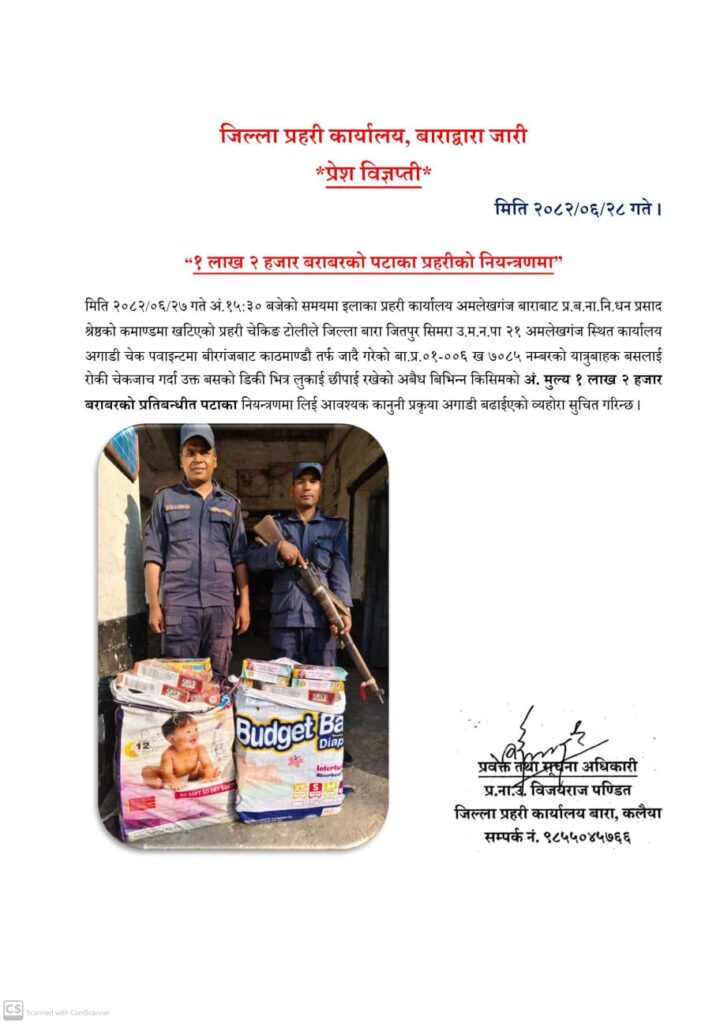मिति २०८२/०६/२७ गते अं.१५:३० बजेको समयमा इलाका प्रहरी कार्यालय अमलेखगंज बाराबाट प्र.ब.ना.नि.धन प्रसाद श्रेष्ठको कमाण्डमा खटिएको प्रहरी चेकिङ टोलीले जिल्ला बारा जितपुर सिमरा उ.म.न.पा २१ अमलेखगंज स्थित कार्यालय अगाडी चेक पवाइन्टमा बीरगंजबाट काठमाण्डौ तर्फ जादै गरेको बा.प्र.०१-००६ ख ७०८५ नम्बरको यात्रुबाहक बसलाई रोकी चेकजाच गर्दा उक्त बसको डिकी भित्र लुकाई छीपाई रखेको अबैध बिभिन्न किसिमको अं. मुल्य १ लाख २ हजार बराबरको प्रतिबन्धीत पटाका नियन्त्रणमा लिई आवश्यक कानुनी प्रकृया अगाडी बढाईएको व्यहोरा सुचित गरिन्छ ।
