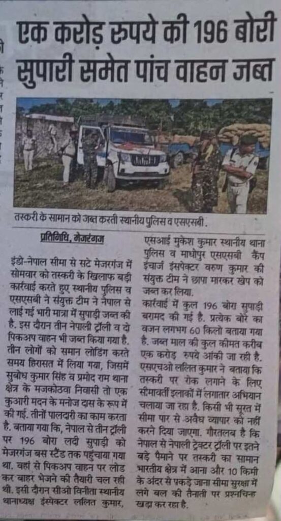 १९६ बोरा सुपारी इन्डो नेपाल सीमासँग जोडिएको मेजरगंजमा सोमबार बरामद भएको भारतीय पत्रिका प्रभात खबरमा समाचार छ । १ सय ९६ बोरा सुपारी बोकेका ३ ट्रली (ट्रक) र २ वटा पिकअपसहित एसएसबीले बरामद गरेको उक्त पत्रिकाले जनाएको छ । सुपारीसमेत ३ जनालाई पक्राउ पनि गरिएको छ ।