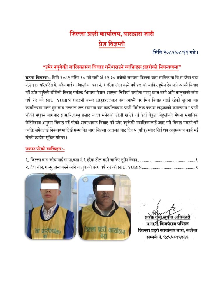 मंसिर १० गते, राती अं.२२:३० बजेको समयमा जिल्ला बारा साविक गा.वि.स.हरैया वडा नं.२ हाल परिवर्तित ऐ. करैयामाई गाउँपालीका वडा नम्बर १ हरैया टोल बस्ने बर्ष ४४ को जाकिर हुसेन देवानले आफ्नै छोरीको विवाह गर्ने उमेर नपुगेकी छोरीको विवाह पर्यटक भिसामा नेपाल आएका चिनियाँ नागरिक गान्सु प्रान्त बस्ने अनि बालुबाको छोरा वर्ष २२ को NIU, YUBIN राहदानी नम्बर EQ3877404 संग आफ्नै घर भित्र विवाह गराई रहेको सुचना प्राप्‍त भएपछि प्रहरीले उक्त स्थानमा गई प्रहरी निरीक्षक प्रकाश खड्काको कमाण्डमा र प्रहरी चौकी मधुवन बाराबाट प्र.स.नि.शम्भु प्रसाद यादव समेतको टोली खटिई गई हेर्दा बेहुला बेहुलीको भेषमा समाजिक रितिरिवाज अनुसार विवाह गर्दै गरेको अवस्थाबाट विवाह गर्ने उमेर नपुकेकी नबालिकालाई उद्दार गरी विवाह गराउने-गर्ने गराउने समेतलाई नियन्त्रणमा लिई सम्मानित बारा जिल्ला अदालत बाट (पाँच) दिनको म्याद लिई थप अनुसन्धान कार्य भई रहेको बारा प्रहरीले जनाएको छ ।