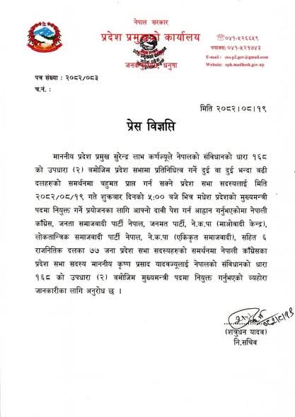 संविधानको धारा १६८ को ३ बमोजिम ठूलो दलको हैसियतमा मुख्यमन्त्री बनेका नेकपा एमाले संसदीय दलका नेता सरोज कुमार यादवले मङ्सिर १७ गते राजीनामा दिएपछि उपधारा २ बमोजिम नयाँ सरकार गठनका लागि प्रदेश प्रमुखको कार्यालयले आह्वान गरेको थियो ।