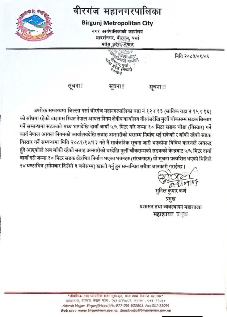 पर्साका वीरगञ्ज महानगरपालिकाले नगर क्षेत्रको प्रमुख सडक विस्तार कार्यलाई तीव्र बनाउँदै नेपाल आयल निगम क्षेत्रीय कार्यालयदेखि मुर्ली चौकसम्मको सडक खण्डमा केन्द्र रेखाबाट दायाँ–बायाँ ५/५ मिटरका दरले सडक चौडा बनाउने निर्णय कार्यान्वयनमा ल्याएको छ।
